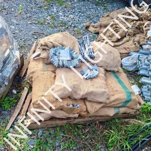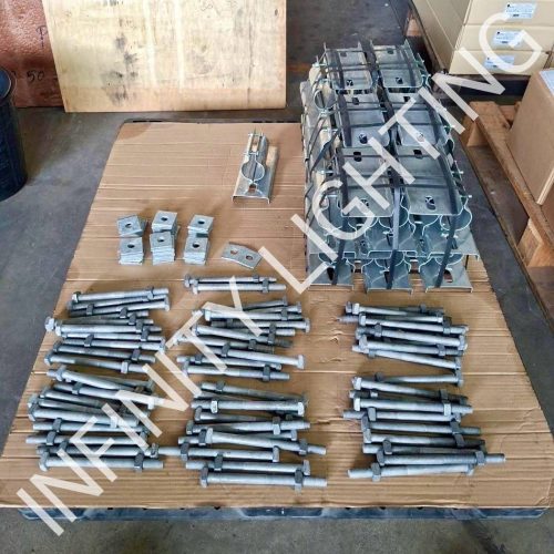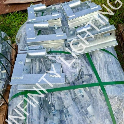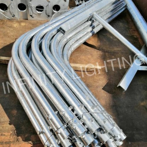 งานกิ่งโคมประปากัลวาไนซ์ 1.5″ ระยะยื่น 1.2 เมตร R300 คาดเหลือง + ขาจับปรับได้ 1.5″ ชุบกัลวาไนซ์ + น็อตยึดเสาไฟ 5/8″×12″ พร้อมแหวนเหลี่ยม ชุบกัลวาไนซ์